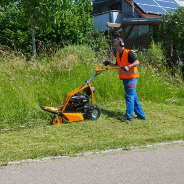 Deze bosmaaier met 4 wielen heeft een gekruist messensysteem dat zonder problemen maait en slijpt.