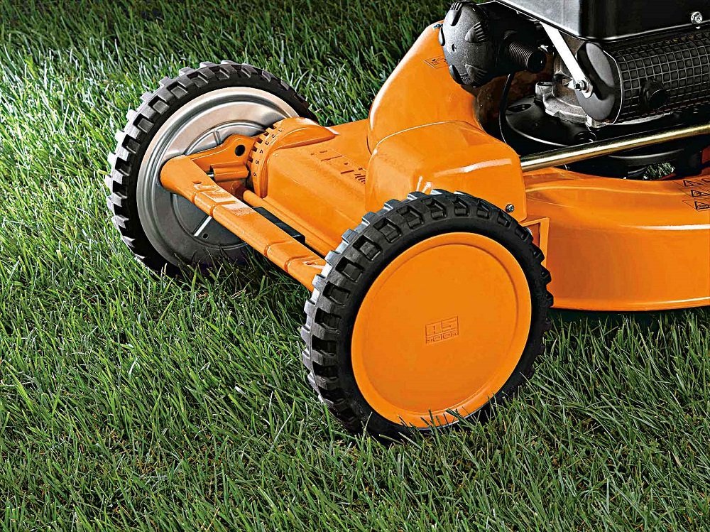 Het hoge koppel dat door de tweetaktmotor wordt gegenereerd, zorgt ervoor dat de benzinegrasmaaier ook op hoger en nat gras volledige prestaties levert. Het derde krukaslager biedt in combinatie met de veiligheidsmesdrager en de wrijvingsschijven op het vleugelmes
