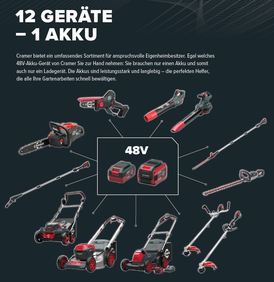 Met de Cramer accumaaier 48LM41K4 kit kunt u genieten van een opmerkelijk 48V lithium-ion accuvermogen en kunt u uw gazon maaien zonder de uitlaatgassen, het lawaai, de onderhoudsinspanningen en startproblemen die optreden bij grasmaaiers met benzinemotor!