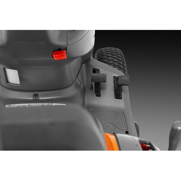 Snelheid en richtingsregeling door pedaalgestuurde hydrostatische versnellingen. Scheidbandjes voor naar voren en achteruit.