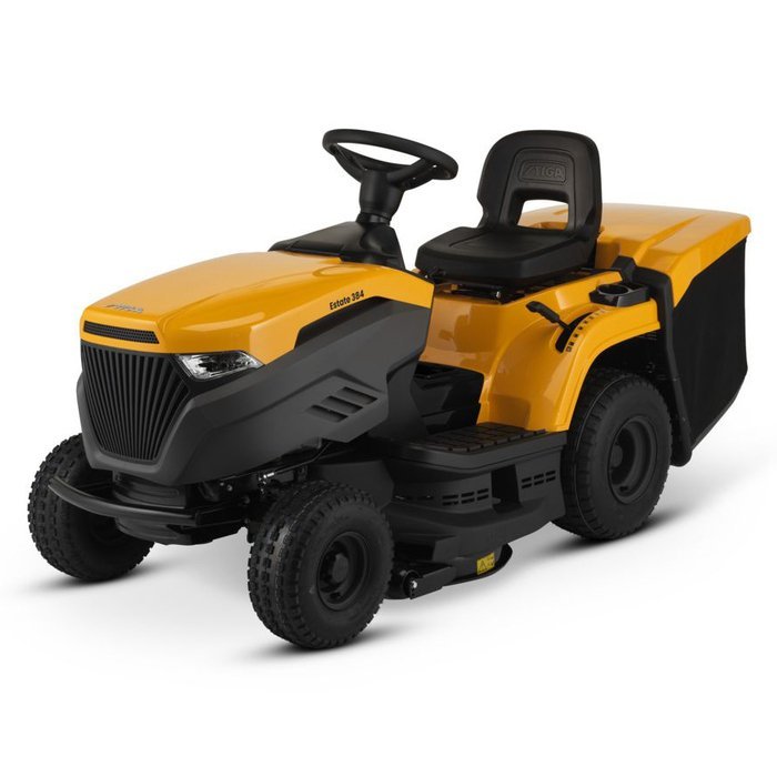 De STIGA-rijmaaier ESTATE 384 SE uit de serie ESSENTIAL is uitgerust met een Stiga-motor van 414 cm3, breedte 84 cm dubbele messenmaaier en 200 liter achterstoel.
