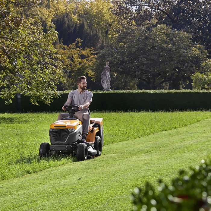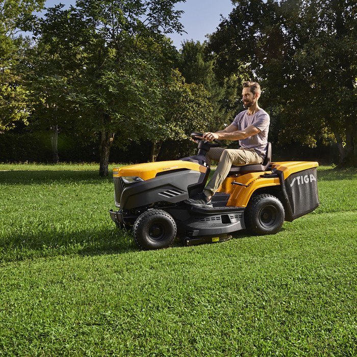 STIGA Grastractwagen 698 uit de serie Experience Liters Fuel Tank, 98 cm Snijbreedte en 240 liter vangkorf. Dit maakt het perfect voor het maaien tot 4.500 m2 – ongeveer zo groot als een voetbalveld.