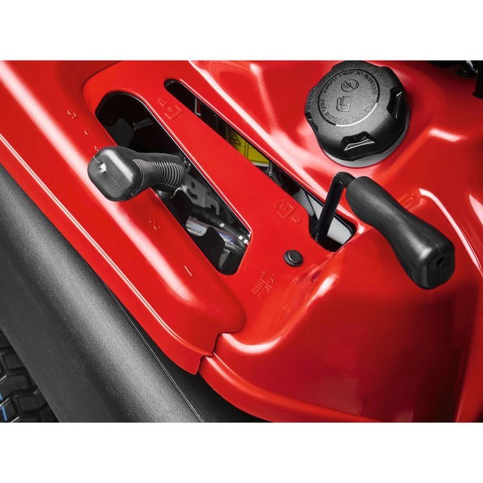 De maaihoogte kan in 5 standen van 38 tot 95 mm eenvoudig worden aangepast. Beide hendels zijn ergonomisch aan de rechterkant van de stoel bevestigd.